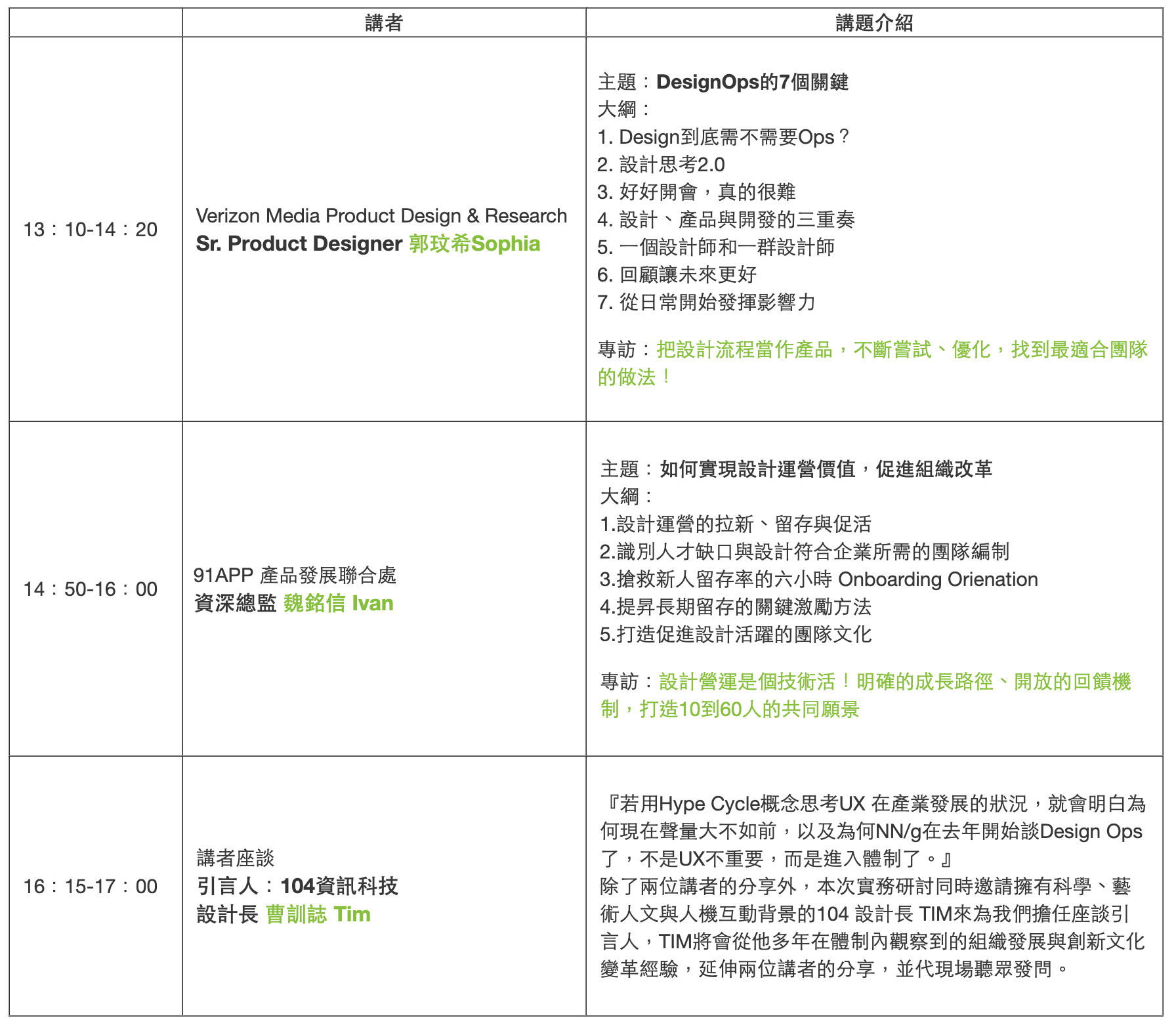 本次實務研討,Verizon Media 的 Sophia 將分享他們實務上有哪些流程或方式,進行跨部門產品開發、設計的管理,同時要如何確保最後的產出符合使用者與企劃需求。