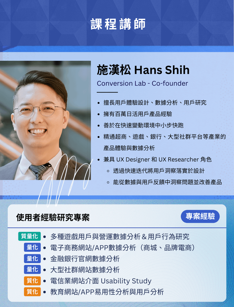- 方案 2:若在鐵粉期間購買實務研討票券,想加購本課程,請私訊悠識 IG 或來信至 edu@userxper.com,索取專屬折扣碼。
