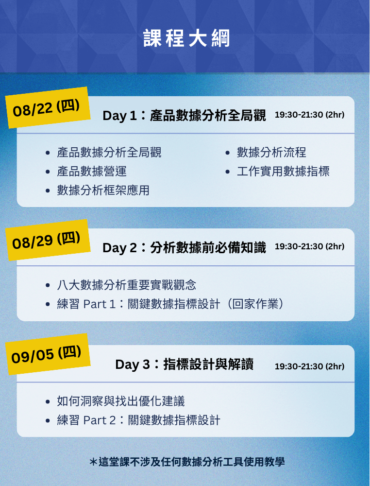 - 08/22, 08/29, 09/05 (四) 線上課程|產品數據分析與關鍵指標設計