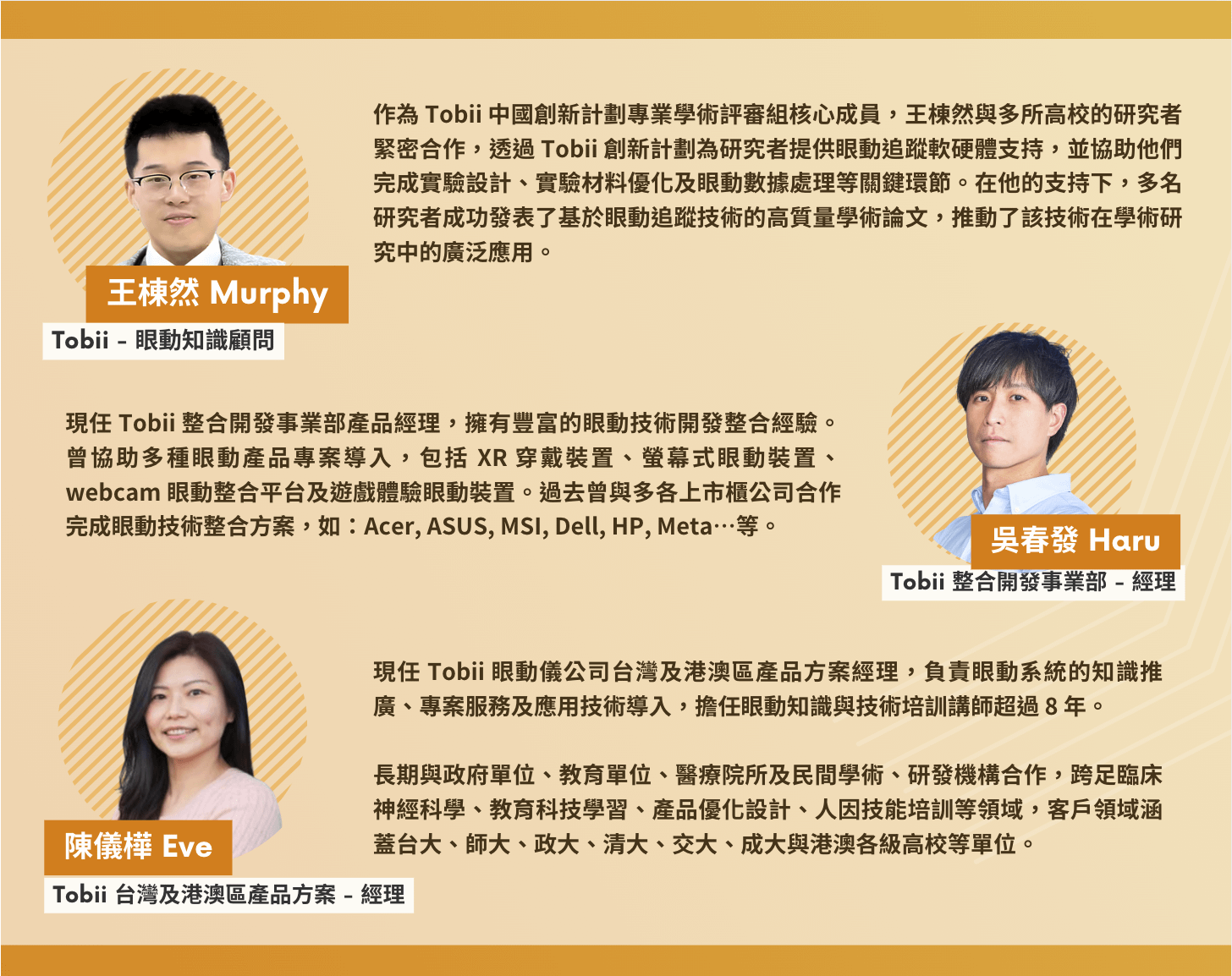 現任 Tobii 整合開發事業部產品經理,擁有豐富的眼動技術開發整合經驗。曾協助多種眼動產品專案導入,包括 XR 穿戴裝置、螢幕式眼動裝置、webcam 眼動整合平台及遊戲體驗眼動裝置。過去曾與多各上市櫃公司合作完成眼動技術整合方案,如:Acer, ASUS, MSI, Dell, HP, Meta…等。