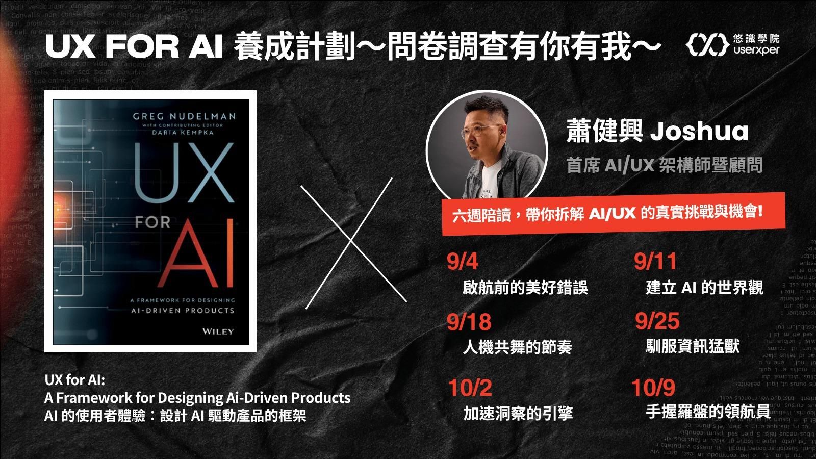 本次與 AI/UX 領航者蕭健興 Joshua 合作的「UX for AI 養成計劃」,將一起共讀《UX for AI: A Framework for Designing AI-Driven Products》重點篇章。作者 Greg Nudelman 與 Daria Kempka 在書中提出「Agentic UX」,將數位產品設計為與 AI 代理協作的夥伴,而不只是單純的操作工具。