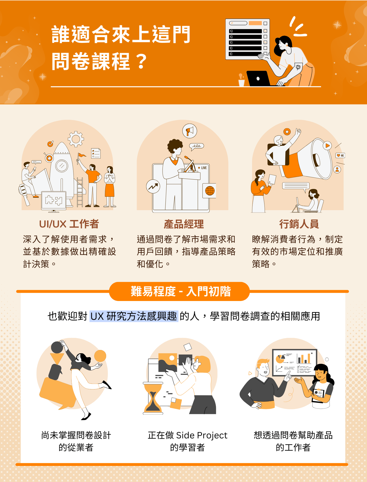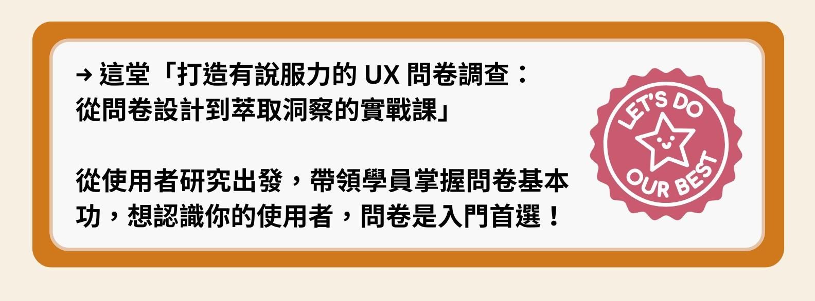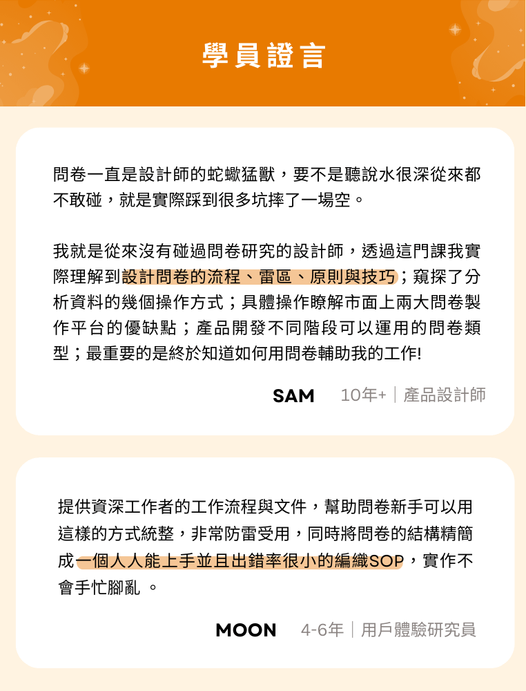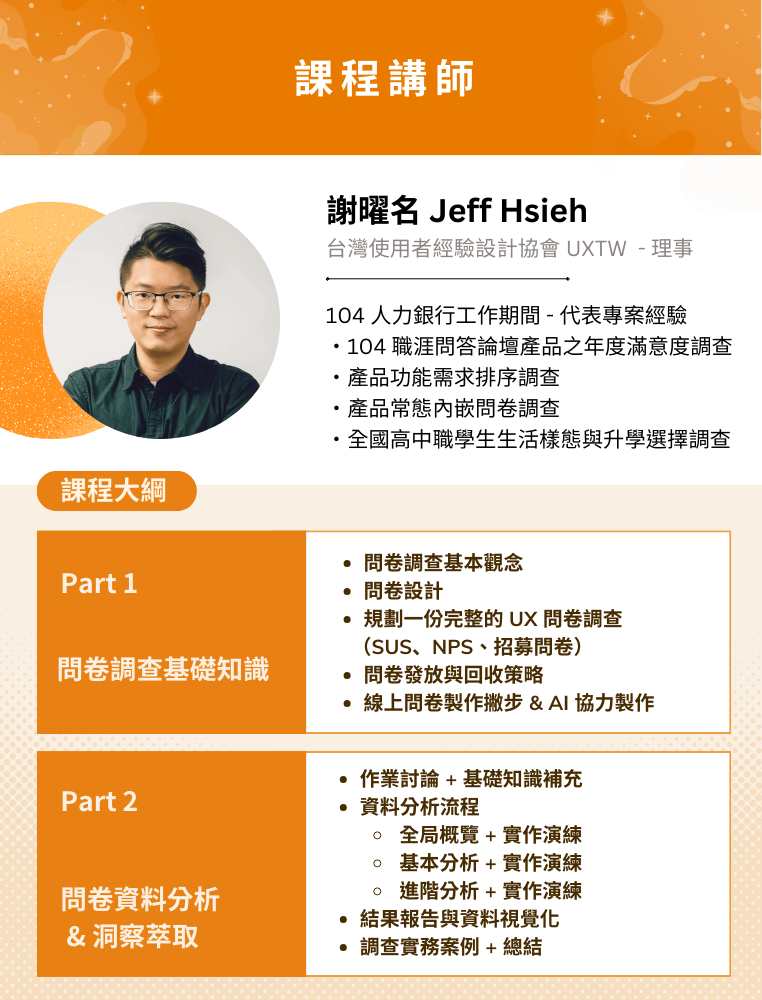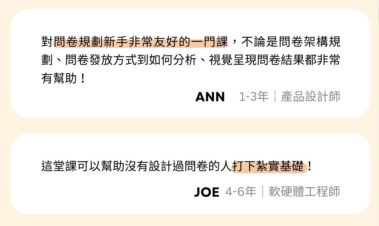 2025/05/06 更新:本課程第一梯次已結束,感謝學員支持!若對問卷調查感興趣,可來信 edu@userxper.com 詢問企業內訓,或期待第二梯次,謝謝🙏
