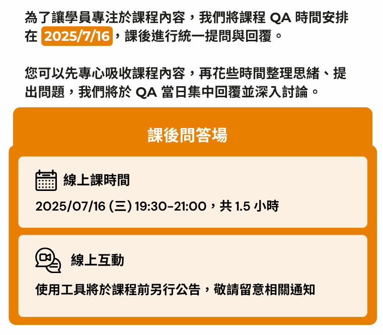 - 上課時間:2025/07/16 (三) 19:30 ~ 21:00,共 1.5 小時