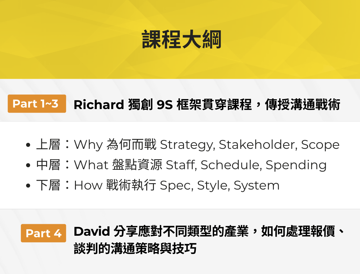 - 教學比例:經驗傳授 65% + 案例分享 20% + QA 討論 15%