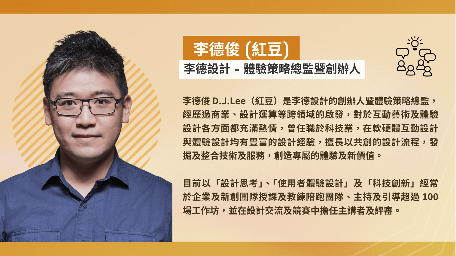 李德俊 D.J.Lee(紅豆)是李德設計的創辦人暨體驗策略總監,經歷過商業、設計運算等跨領域的啟發,對於互動藝術及體驗設計各方面都充滿熱情,曾任職於科技業,在軟硬體互動設計與體驗設計均有豐富的設計經驗,擅長以共創的設計流程,發掘及整合技術及服務,創造專屬的體驗及新價值,目前以「設計思考」、「使用者體驗設計」及「科技創新」經常於企業及新創團隊授課及教練陪跑團隊、主持及引導超過 100 場工作坊,並在設計交流及競賽中擔任主講者及評審。